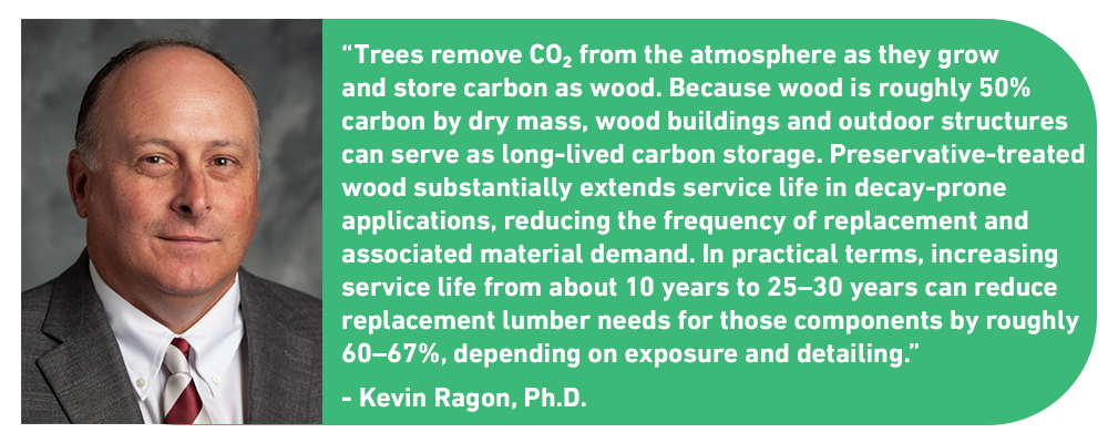 Sustainability is about longevity as well as renewal. As Dr. Ragon notes, “trees remove CO₂ from the atmosphere as they grow and store carbon as wood, and because wood is roughly 50 percent carbon by dry mass, wood buildings and outdoor structures can serve as long-lived carbon storage. Preservative treatment enhances this benefit by substantially extending service life in decay-prone applications, reducing the frequency of replacement and associated material demand. In practical terms, increasing service life from roughly 10 years to 25 to 30 years can reduce replacement lumber needs for those components by approximately 60 to 67 percent, depending on exposure conditions and detailing”.